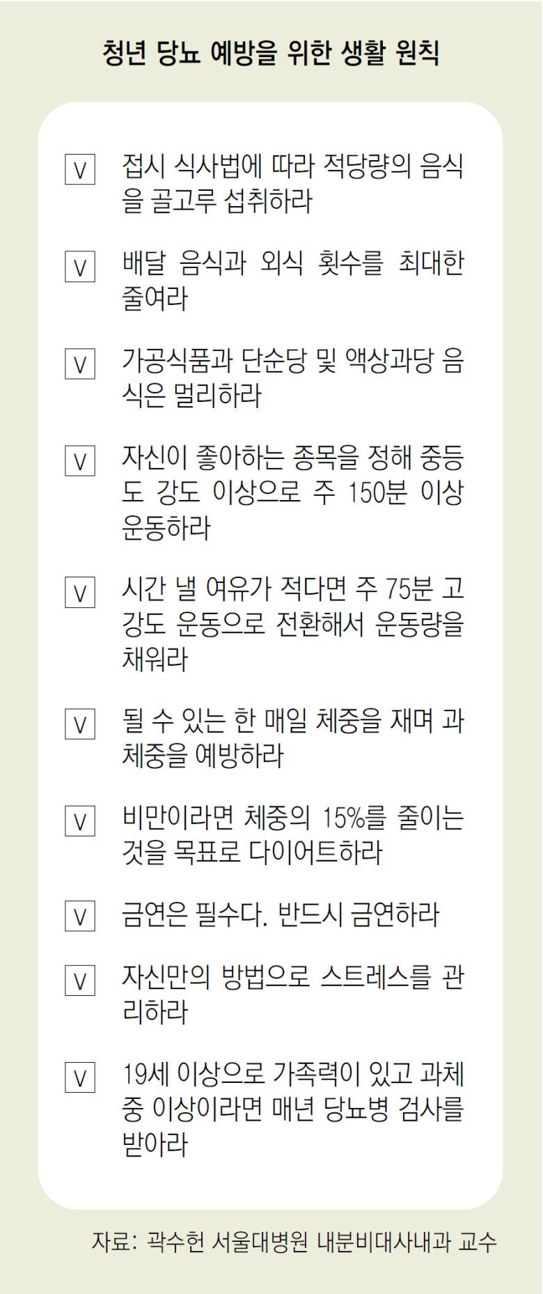 곽수헌 서울대병원 내분비대사내과 교수는 청년 당뇨가 급증하는 원인은 비만이라며 야식이나 간식, 외식을 줄여 섭취 열량을 낮추고 운동을 병행해 체중을 줄일 것을 주문했다. 곽 교수는 청년 당뇨가 중년 당뇨보다 투병 기간이 길기 때문에 합병증도 더 심각하다며 즉각적이고 꾸준한 치료를 받아야 한다고 했다. 서울대병원 제공
