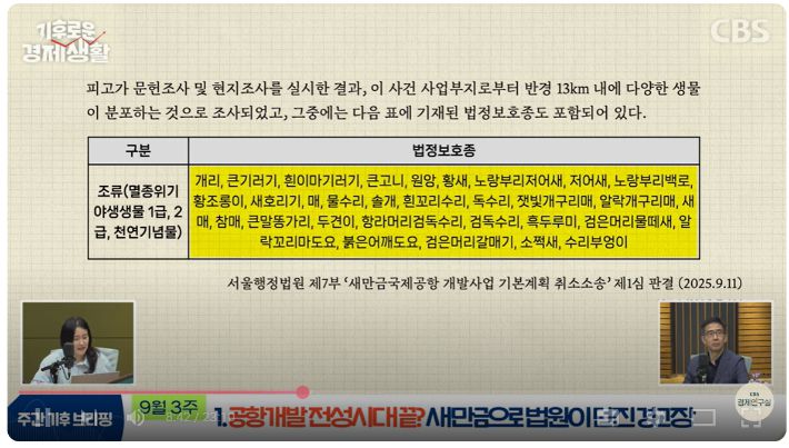 ◇ 최서윤> 맞아요. 그러니까 이 3명이 당사자가 되는 거고요. 원고 적격성 판단과 같은 이야기들도 나오지만 중요하지 않은 부분이에요. 왜냐하면 판결문이 총 69페이지거든요. 그런데 12쪽부터 47쪽까지인 36페이지, 절반 이상을 할애해서 새만금신공항 건설사업 기본계획의 위법성을 따지고 있습니다. 결론이 위법이라는 건데 이유를 짚어드릴게요. 우선 재판부에서 국토부가 새만금신공항 건설 사업 기본 계획을 수립하면서 조류 충돌 위험과 인근 조류 서식 환경에 미치는 영향을 부실하게 조사하고 평가했다고 명확하게 지적했습니다. 여기에 대해서 국토부는 공항이 건설되고 항공기를 운항하면 인위적 교란이 발생하면서 조류가 알아서 주변 유사 서식지로 이동하고 회피할 걸로 예상된다고 설명했어요. 어차피 사업 부지 내에 법정보호종이 서식하지 않으니 건설해도 직접적인 서식지 훼손은 발생하지 않는다고 주장을 펼쳤는데 법원은 그렇지 않다고 본 겁니다.