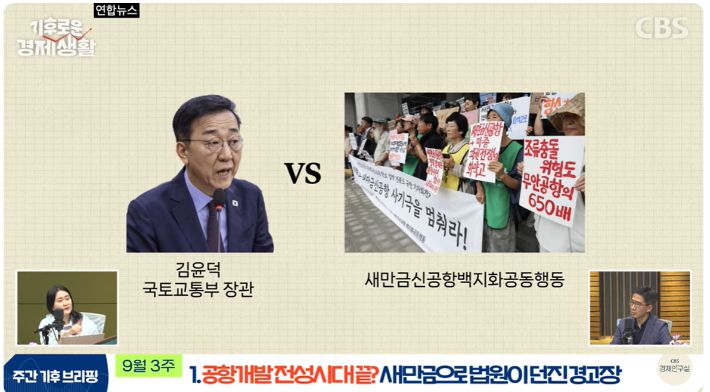 ◇ 최서윤> 공항 개발 전성시대 끝, 새만금으로 법원이 던진 경고장. 지난주에 나온 법원의 새만금신공항 기본계획 취소 1심 판결 소식을 가져왔습니다. 가뜩이나 내년에 지방선거 앞두고 우려되는 이슈예요. 정치권에서 무분별하게 지역 신공항 건설을 추진하고 있어서 문제가 되고 있는데 법원이 강력하게 제동을 걸었습니다.