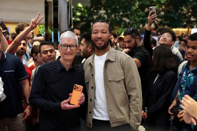 팀 쿡 애플 최고경영자(CEO)가 19일(현지시간) 미국 뉴욕 맨해튼 애플스토어에서 아이폰 17시리즈 출시를 기념해 NBA 뉴욕 닉스 소속 제일런 브런슨과 함께 기념사진을 촬영하고 있다. /로이터=뉴스1