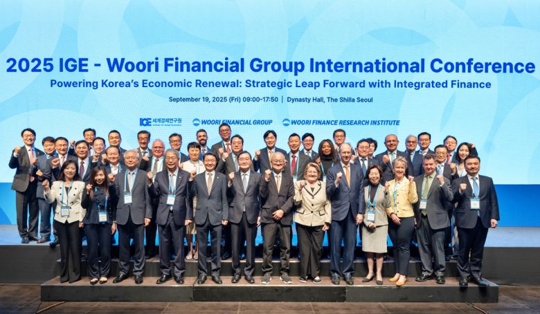 지난 19일 서울 중구 신라호텔에서 열린 ‘2025 세계경제연구원-우리금융그룹 국제컨퍼런스’에 (앞줄 왼쪽 네번째부터)임종룡 우리금융그룹회장, 이억원 금융위원장, 전광우 세계경제연구원 이사장, 성기학 영원무역 회장, 앤 크루거(Anne Krueger) 스탠퍼드대 석좌교수·전 IMF 및 세계은행 수석부총재 등 국내외 주요 금융·학계 인사들이 참석해 기념촬영을 하고 있다. 우리금융 제공