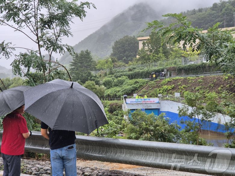 강원 강릉에 단비가 내린 20일 오후 강릉 성산면 오봉리 한국수력원자력 강릉수력발전소에서 예정된 도암댐 도수관로 저류수 방류를 보기 위한 주민과 시 관계자들이 우산을 쓰고 현장을 바라보고 있다. 2025.9.20/뉴스1 ⓒ News1 윤왕근 기자 |