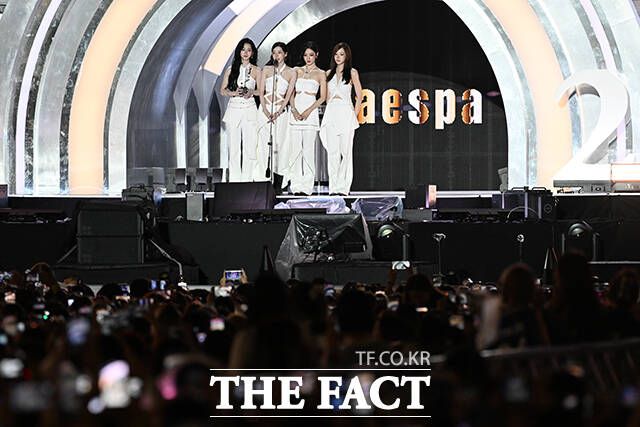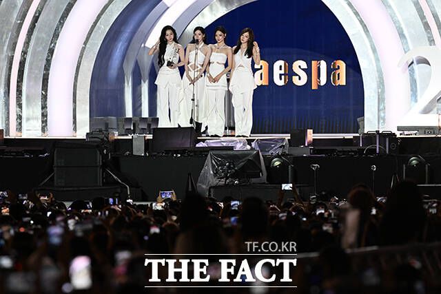 <더팩트>가 주최하고 팬앤스타와 더스퀘어이엔엠이 주관하는 '2025 더팩트 뮤직 어워즈(THE FACT MUSIC AWARDS, TMA)'가 20일 오후 '마카오 아웃도어 퍼포먼스 베뉴'에서 열린 가운데 그룹 에스파가 '올해의 아티스트'를 수상하고 있다. /마카오=서예원 기자 |