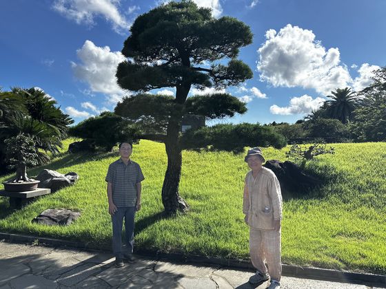 성범영 생각하는 정원 원장(오른쪽)과 아들인 성주엽 대표이사가 지난 8월 25일 정원의 소나무 앞에서 미소를 짓고 있다. 최충일 기자 |