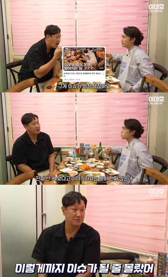 이런저런 이야기를 나누며 식사를 하던 두 사람. 허형범은 "최근에 경남고 대통령배 우승하고 (회식이) 이슈가 엄청 됐잖아요. 저한테 왜 그걸 물어보는지 모르겠는데, 제일 많이 물어보는 게 '진짜 이대호가 산 거 맞냐'고 하더라"라며 최근 이슈된 회식에 대해 언급했다.