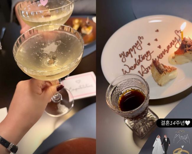공개된 사진 속에는 결혼 14주년을 맞이해 고급 레스토랑을 찾은 심진화와 김원효의 모습이 담겼다. 정갈하고 고급스러운 인테리어에 걸맞는 화려한 코스 음식이 눈길을 끈다.