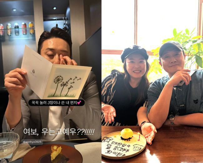 특히 심진화는 "꾹꾹 눌러 3장이나 쓴 편지. 여보 우는거에요?"라는 글과 함께 김원효의 모습을 담아 올렸다. 김원효는 심진화가 직접 쓴 것으로 보이는 편지를 읽으며 눈시울을 붉혔다.
