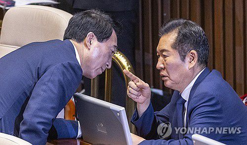 더불어민주당 정청래 대표가 10일 서울 여의도 국회 본회의에서 박수현 수석대변인과 대화하고 있다. 2025.9.10 [연합뉴스 자료사진] |