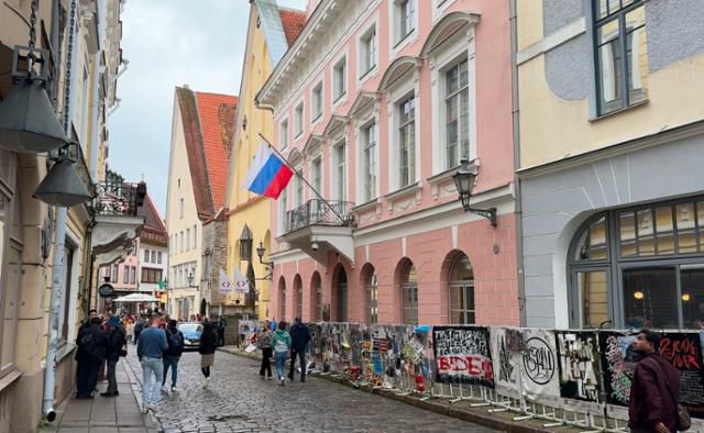 20일 에스토니아 수도 탈린의 주에스토니아 러시아대사관 앞에 시민들이 모여 있다. 대사관 앞엔 우크라이나와 전쟁을 규탄하는 현수막 등이 걸려 있다. 탈린=뉴스1 |