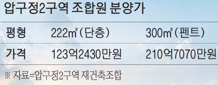 그렇더라도 압구정 2구역 조합원 사이에서는 동요가 크지 않은 것으로 알려졌다. 최근 강남 집값 추이를 보면 재건축 후 시세가 3.3㎡당 3억원을 능가할 것이라는 기대까지 나오기 때문이다. 시공사 선정을 앞두고 각종 제안이 나오면서 상품성이 좋아졌다는 시각도 있다.