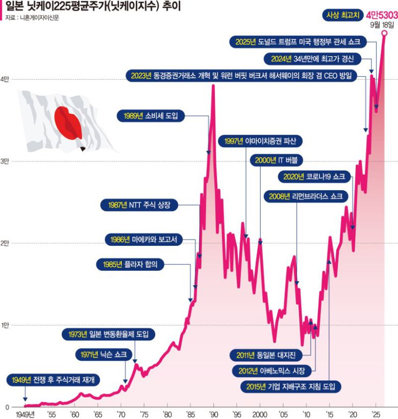 이달 들어서는 이시바 시게루 일본 총리 퇴임 이후 일본 차기 정권에 대한 기대감과 미일 관세 불확실성 해소, 미 연방준비제도(연준)의 금리 인하 결정 등이 닛케이지수를 추가로 밀어올리고 있다.