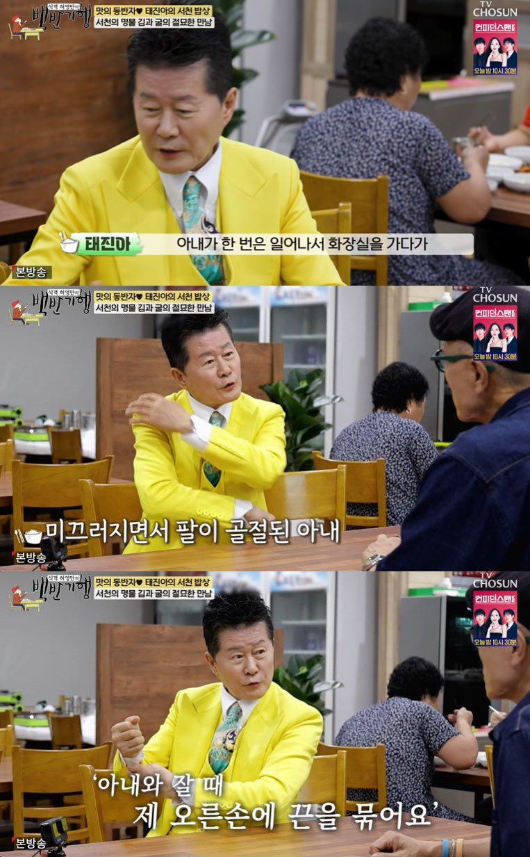 식당을 찾은 음식이 나오기 전 대화를 나눴다. 허영만이 태진아에게 "사모님이 오랫동안 아프셨다고 들었다"라고 하자, 태진아는 "아내가 치매로 6년째 고생하고 있다"고 털어놔 안타까움을 자아냈다. 이어 "치매는 세상에서 가장 나쁜 병이다"라고 덧붙였다.
