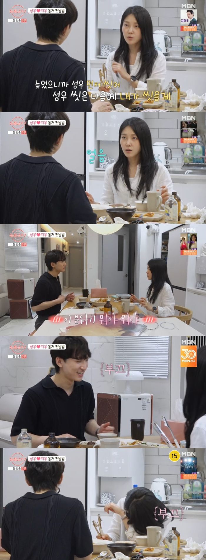 성우가 “설거지는 내가 할게. 뭐라도 하고 싶다”고 하자 지우는 “늦었으니까 성우 먼저 씻어. 설거지하고 그다음에 내가 씻을게”라고 했다. 눈을 맞춘 두 사람은 부끄러운 듯이 미소만 남겼고 지우는 “미쳤나 봐”라며 고개를 떨궜다.