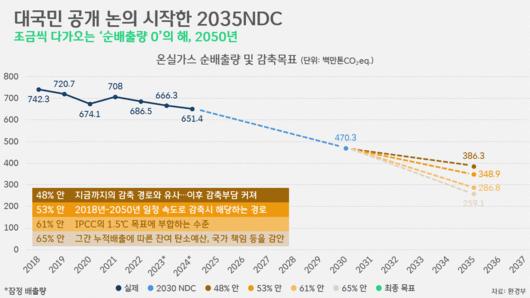 ③ 2018년 순배출량 대비 61% 감축: IPCC(Intergovernmental Panel on Climate Change, 기후변화에 관한 정부간 협의체)는 전 지구적으로 1.5℃ 목표를 달성하기 위해 온실가스를 얼마나 줄여야 하는지 연도별 경로를 제시했습니다. 이에 따르면, 2019년 순배출량 대비 2035년엔 60% 이상 감축해야 하는데, 우리나라의 NDC 기준점은 2018년인 만큼, 이를 반영해 '2018년 대비 61% 감축'이라는 숫자가 도출됐습니다. 다만, IPCC 차원에서 제시된 감축률은 '세계 평균'입니다. 지금까지의 국가별 온실가스 누적 배출량에 따른 가중치가 반영된 숫자가 아니기에, 1750~2023년 국가별 누적 배출량 16위인 한국이 이러한 '평균값' 수준의 감축을 하는 것에 대한 비판의 여지가 남아있습니다.