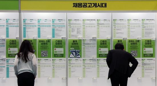 올해 상반기 상용근로자 임금총액 상승률이 오른 가운데 대·중소기업 간 격차는 커진 것으로 나타났다. 사진은 서울 강남구 코엑스에서 열린 강남구 취업박람회를 찾은 구직자들이 채용공고 게시판을 확인하고 있는 모습. |