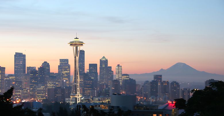 여명이 밝아오는 시애틀의 스페이스니들과 멀리 보이는 레이니어산