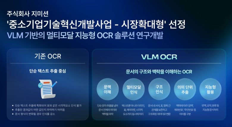 선정된 연구과제는 ‘VLM 기반의 멀티모달 지능형 OCR 솔루션 연구개발’로, 지미션은 이번 연구를 통해 기존 딥러닝 AI OCR 기술의 한계를 극복하고 AI 전환(AX) 시대에 적합한 지능형 문서처리 솔루션을 개발한다는 계획이다.