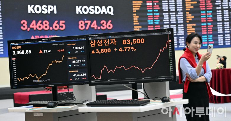 아시아투데이 송의주 기자 = 코스피는 22일 삼성전자 강세와 미중 관계 개선 기대감 속에 또 사상 최고치를 경신했다. 이날 코스피는 전 거래일(3445.24)보다 23.41포인트(0.68%) 오른 3468.65에 장을 마쳤다. 사진은 서울 여의도 한국거래소 홍보관의 모습.