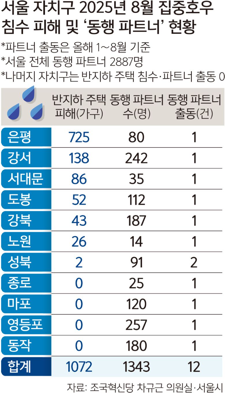 올해 1∼8월 서울시 25개 자치구 동행 파트너 출동 건수는 12건에 그쳤다. 성북구 2건, 종로·강북·도봉·노원·은평·서대문·마포·강서·영등포·동작구 각 1건이다. 시 관계자는 “침수 예보 단계에선 시가 출동 지시를 내리면 자치구가 이를 전달해 출동이 이뤄지고 침수 경보는 자치구가 발령 권한을 가져 직접 출동 지시를 한다”면서 “동행 파트너 인원수 기준으로는 1∼8월 침수 예보 발령 12건에 511명이 출동했다”고 설명했다.