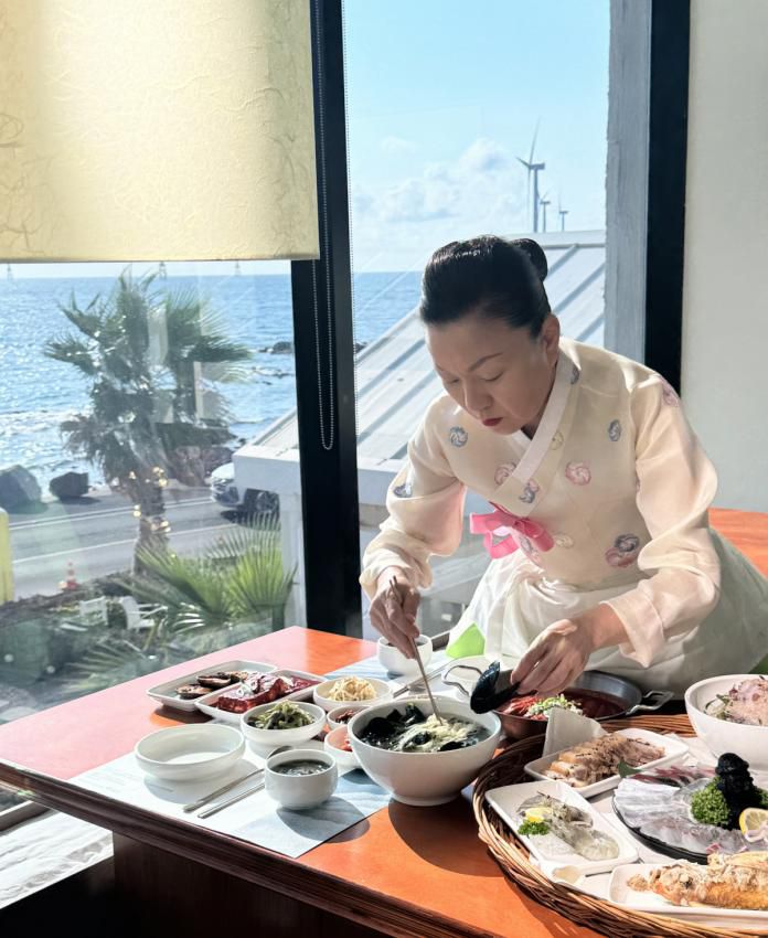 Chef Kim Mi-ryeong prepares signature dishes of Bada Sulsang, including seafood, cold raw fish soup, and seaweed noodles, for her guests. The dazzling Aewol coast stretches outside the window beside the table. / Courtesy of Bada Sulsang |