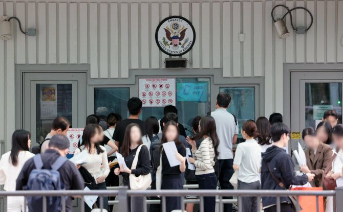 22일 서울 종로구 미국대사관 앞에서 비자를 발급받으려는 시민들이 줄을 서고 있다. (사진=연합뉴스)