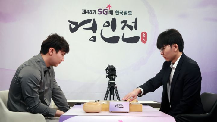 22일 경기도 성남시 K바둑 스튜디오에서 열린 제48기 SG배 명인전 결승 3번기 1국에서 신진서 9단이 '디펜딩 챔프' 박정환 9단을 맞아 167수 만에 흑 불계승을 거두며 기선을 제압했다.