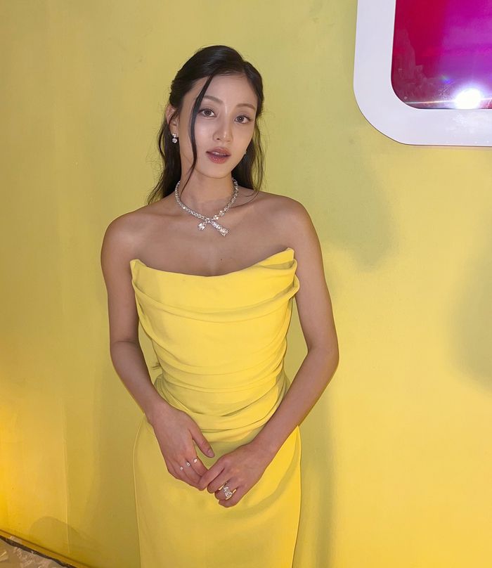 공개된 사진 속 지효는 화사한 옐로 드레스를 완벽하게 소화하며 강렬하면서도 우아한 분위기를 풍겼다.