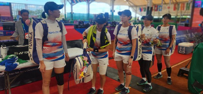 한국 소프트테니스 여자 대표팀이 21일 제9회 문경아시아소프트테니스선수권대회 단체전 결승에서 일본에 아쉽게 우승컵을 내준 뒤 경기장을 빠져나가는 모습. 대회 조직위원회 |
