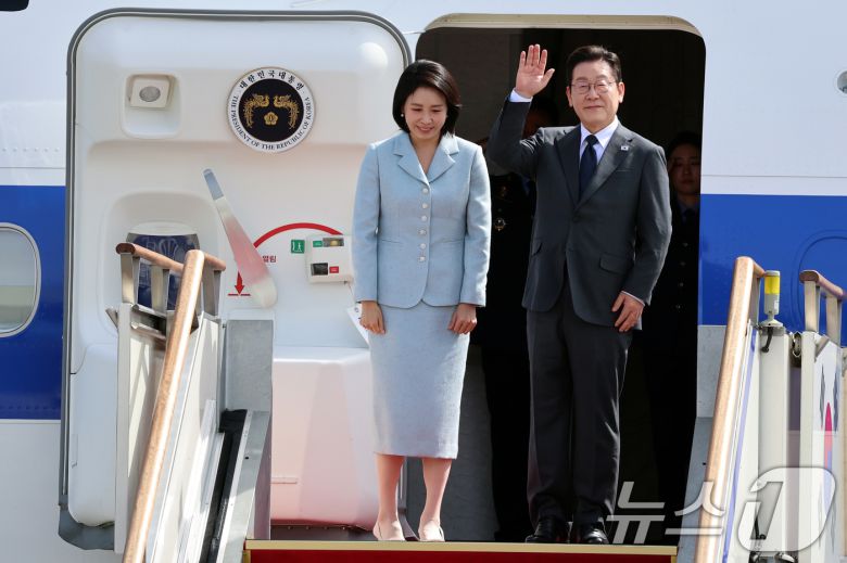 이재명 대통령과 부인 김혜경 여사가 미국 뉴욕에서 열리는 제80차 유엔총회 참석을 위해 22일 오전 경기도 성남 서울공항을 통해 출국하며 인사를 하고 있다. 2025.9.22/뉴스1 ⓒ News1 황기선 기자 |