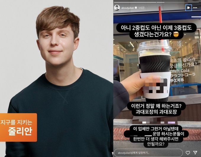 "3중컵 과대포장" 한 카페 저격한 줄리안…역풍 맞고 "경솔" 무슨 일?