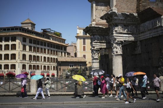 지난 6월 이탈리아 아우구스투스 포럼을 찾은 관광객들이 무더위를 피해 양산을 쓰며 걷고 있다. AP연합뉴스 |