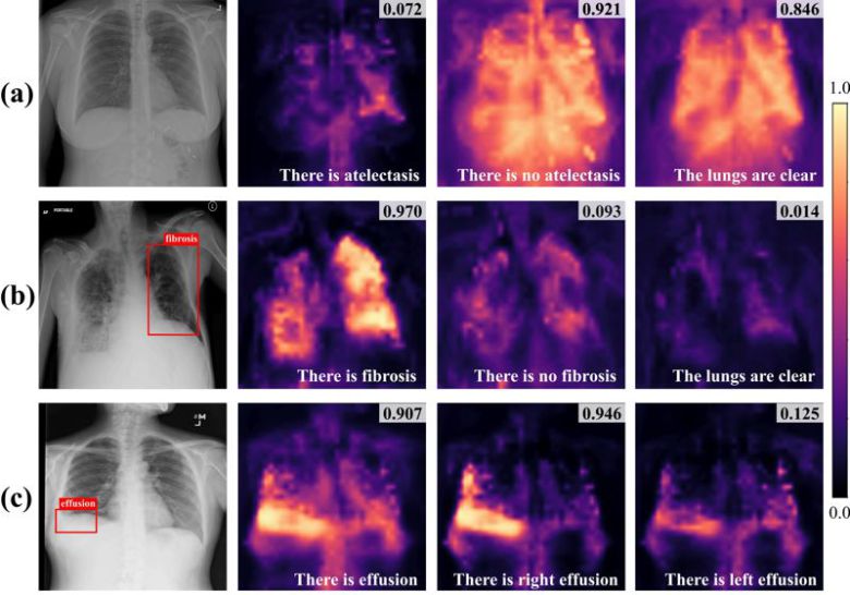 비전-언어 모델이 흉부 X-ray와 판독문의 관계를 학습 유사도를 확률값으로 표현한 모습. 딥노이드 제공. |
