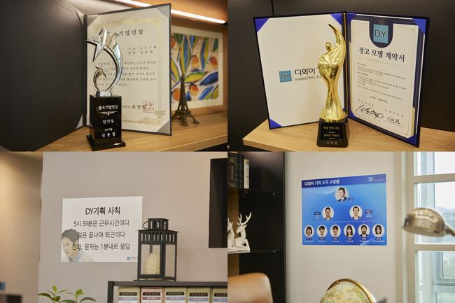 대한민국 국민이라면 다 아는 그 이름, 바로 신동엽! 그의 또 다른 정체는 ‘사업가’라는 사실! 열정이 묻어나는 DY기획 사무실에 들어서면 살벌한 조직도부터 대표 신동엽의 손길이 곳곳에 배어 있는 공지문까지, 현실 회사를 방불케 하는 디테일이 웃음을 유발한다. 사무실 벽면에는 ’주인의식‘을 세뇌시키는 대표의 철학이 담긴 문구가 붙어 있고, 대표실은 구조조정 위기임에도 중소기업인상 인기상, DY기획 광고모델 계약서 등 자랑거리로 가득하다. 위기 속에서도 할 건 다 하고, 자랑은 더 열심히 하는 ‘자기애 만렙’ 대표의 모습은, 현실 직장인의 씁쓸한 웃음을 정통으로 저격한다.