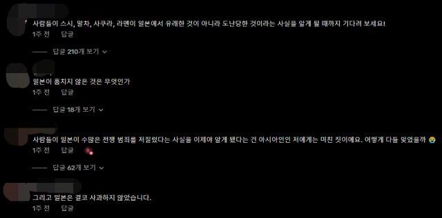 이 밖에도 “일본은 전쟁 범죄를 역사책에 포함하지 않는다. 대부분의 일본인은 자국의 잔혹 행위를 모른다”, “일본은 사과하지 않았다”는 비판이 이어졌다.