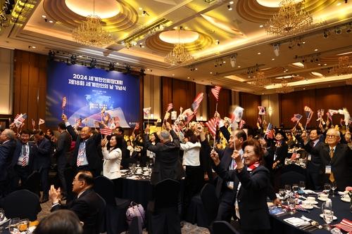 (서울=연합뉴스) 서울 잠실 롯데호텔 월드에서 열린 '2024 세계한인회장대회' 개막식에 참석한 한인회장들이 태극기를 흔들고 있다. [재외동포청 제공]