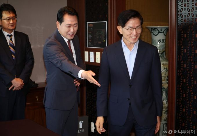 장 대표는 식당 입구에서 김 전 장관을 기다렸다. 뒤이어 도착한 김 전 장관에게 고개숙여 인사한 뒤 상석을 권했다. 장 대표는 김 전 장관에게 "장관님께 조언도, 지혜도 구할 겸, 또 전당대회(당 대표 선거)를 마치고 제대로 인사도 못 드려서 뵙자고 청했다"며 "당내 여러 상황에 대해 저희가 어떻게 문제를 잘 풀어갈지 좋은 말씀과 지혜를 주시면 좋겠다"고 말했다.