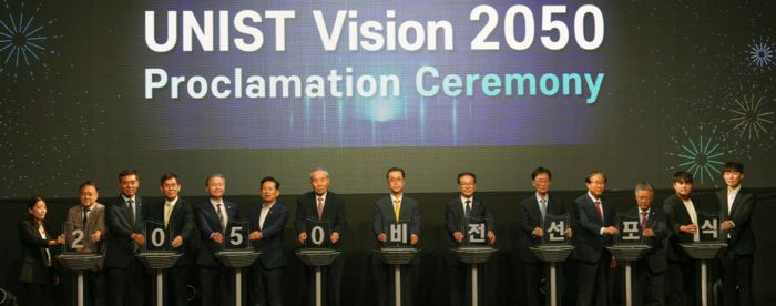 UNIST는 23일 원내 대학본부에서 'UNIST 2050 비전 선포식'을 열고, '인류의 삶에 공헌하는 과학기술 선도대학' 비전과 'UNIque & beST 과학기술 넥서스' 완성을 목표로 밝혔다.