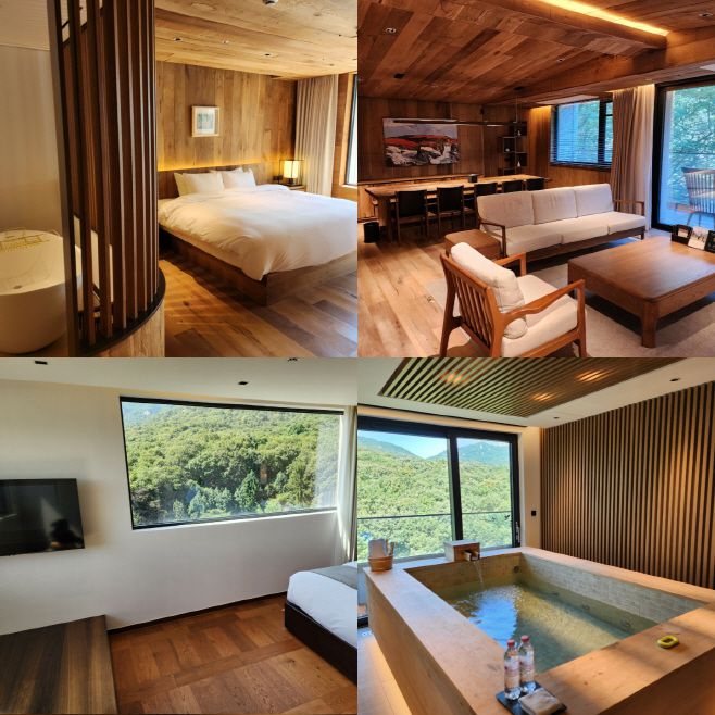 회원권 구매시 이용 가능한 리조트 내부 모습. 회원 중간 등급용 파크하우스(위쪽)와 상위 3번째 회원용인 포레스프 하우스(아래쪽)의 모습. 객실에 따라 히노키 탕, 사우나 등이 설치돼 있다. / 차세영 기자 |