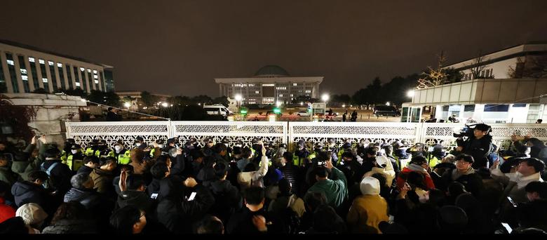 윤석열 대통령이 전격적으로 계엄령을 선포한 3일 밤 서울 여의도 국회 정문 앞에서 경찰병력이 출입을 통제하고 있다.2024.12.3/뉴스1