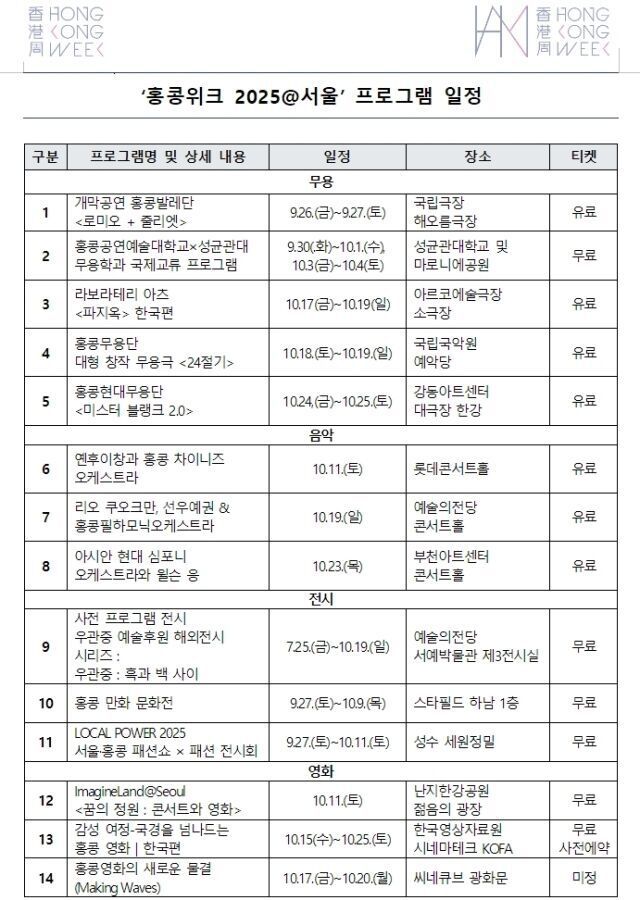 '홍콩위크 2025@서울'는 무용·음악·영화·만화·시각예술·패션 등 14개 프로그램으로 홍콩의 예술성과 문화적 다양성을 소개하고 한국과 홍콩 예술의 협력을 확장하는 국제 문화 교류 축제입니다.