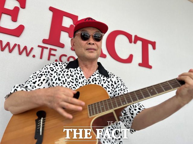 '풀꽃 가수' 박장순이 지난 10일 서울 마포구 상암동 <더팩트> 사옥에서 진행한 인터뷰를 마치고 기타를 멘 채 포즈를 취하고 있다. /이상빈 기자 |