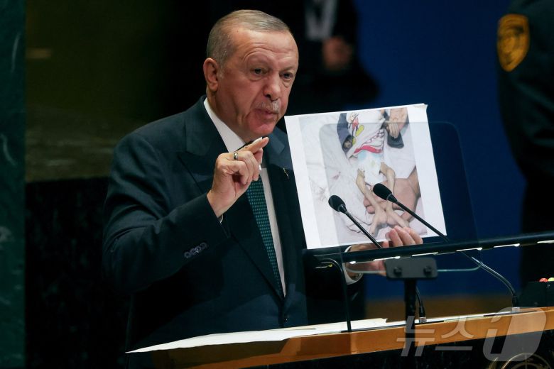 레제프 타이이프 에르도안 튀르키예 대통령이 23일(현지시간) 유엔총회 연설에서 가자지구 상황을 보여주는 사진을 들고 발언하고 있다. 2025.9.23 ⓒ 로이터=뉴스1 ⓒ News1 강민경 기자 |
