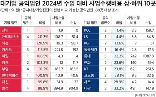 지난해 대기업 공익법인 수입대비 사업수행비용 상하위 10개사 |