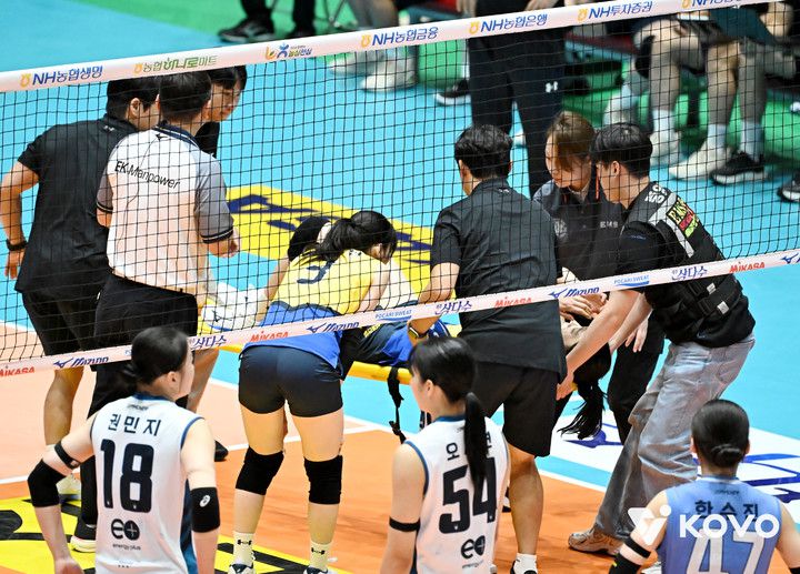 이후 웜업존 한 구석에서 들것에 앉은 채로 현장 관계자들과 한동안 대화한 후 인근 병원으로 이송되는 양효진의 모습이 보였다.