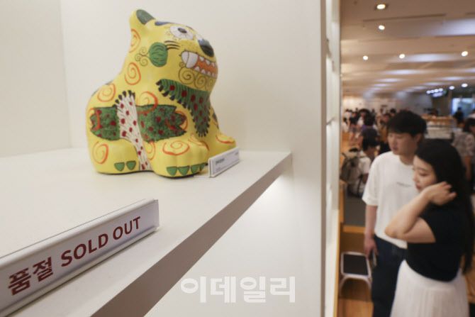 지난달 10일 서울 용산구 국립중앙박물관 공식 굿즈 매장 ‘뮷즈샵’에 상품들 앞에 매진 문구가 붙어 있다. (사진=이영훈 기자) |