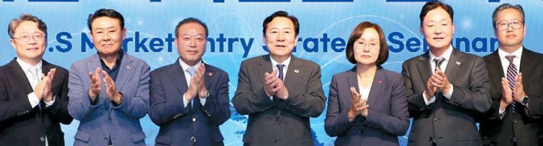 24일 제주 서귀포시 롯데호텔에서 열린 '중기 미국 진출 전략 세미나'에서 참석자들이 사진을 찍고 있다. 왼쪽 둘째부터 강동한 한호산업 대표, 황병구 미주한인상공회의소총연합회장, 김기문 중소기업중앙회장, 바니 리 한미은행장, 박기홍 허브인터내셔널 보험 회장.  중기중앙회