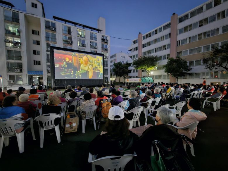 인천도시공사(iH)가 문화 접근이 어려운 임대아파트 입주민을 위해 지난해 처음 운영한 ‘해질녘 영화관’ 현장 모습. 올해는 대상 단지를 확대해 더 많은 입주민에게 영화 감상 기회를 제공하고 있다. iH제공 |