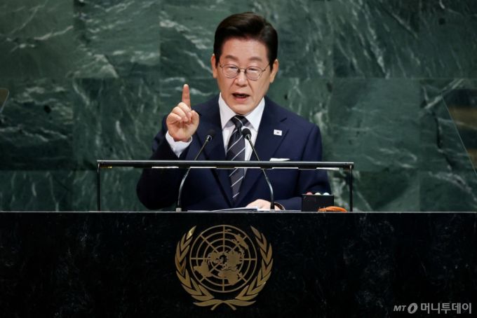 이재명 대통령이 23일(현지시간) 미국 뉴욕 유엔본부에서 열린 제80차 유엔총회에서 기조연설을 하고 있다.         /뉴욕(미국)로이터 =뉴스1