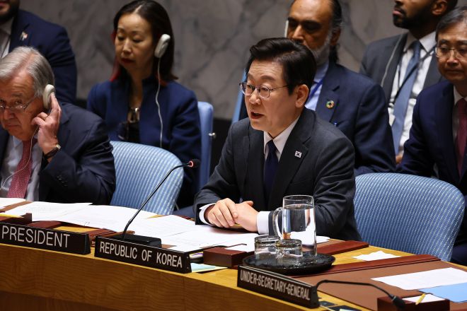 이재명 대통령, 안보리 주재 - 이재명 대통령이 24일(현지시간) 미국 뉴욕 유엔본부에서 안전보장이사회 공개 토의를 주재하고 있다. 뉴욕 연합뉴스 |