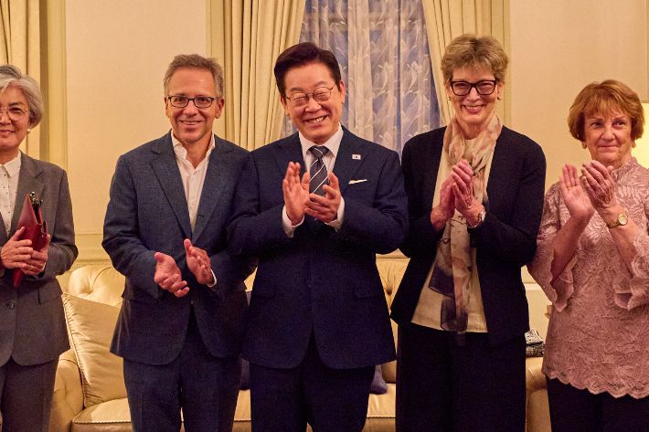이재명 대통령이 23일(현지시간) 미국 뉴욕의 한 호텔에서 열린 외교안보오피니언초청 만찬에서 참석자들과 기념촬영을 하고 있다. 연합뉴스